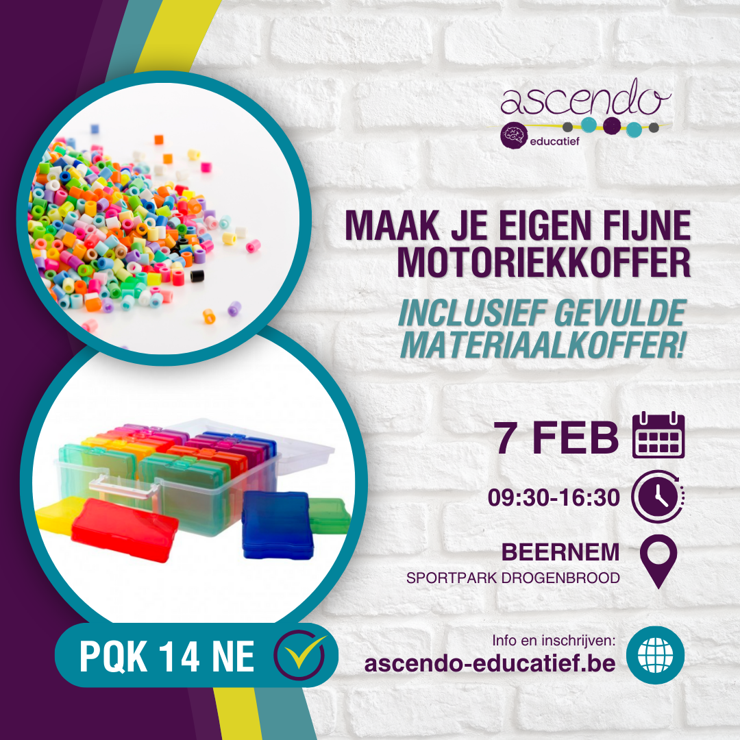 Tijdens deze ervaringsgerichte workshop stel je stap voor stap je eigen fijnmotoriekkoffer samen: een praktische toolkit vol speelse, motiverende materialen en oefeningen.